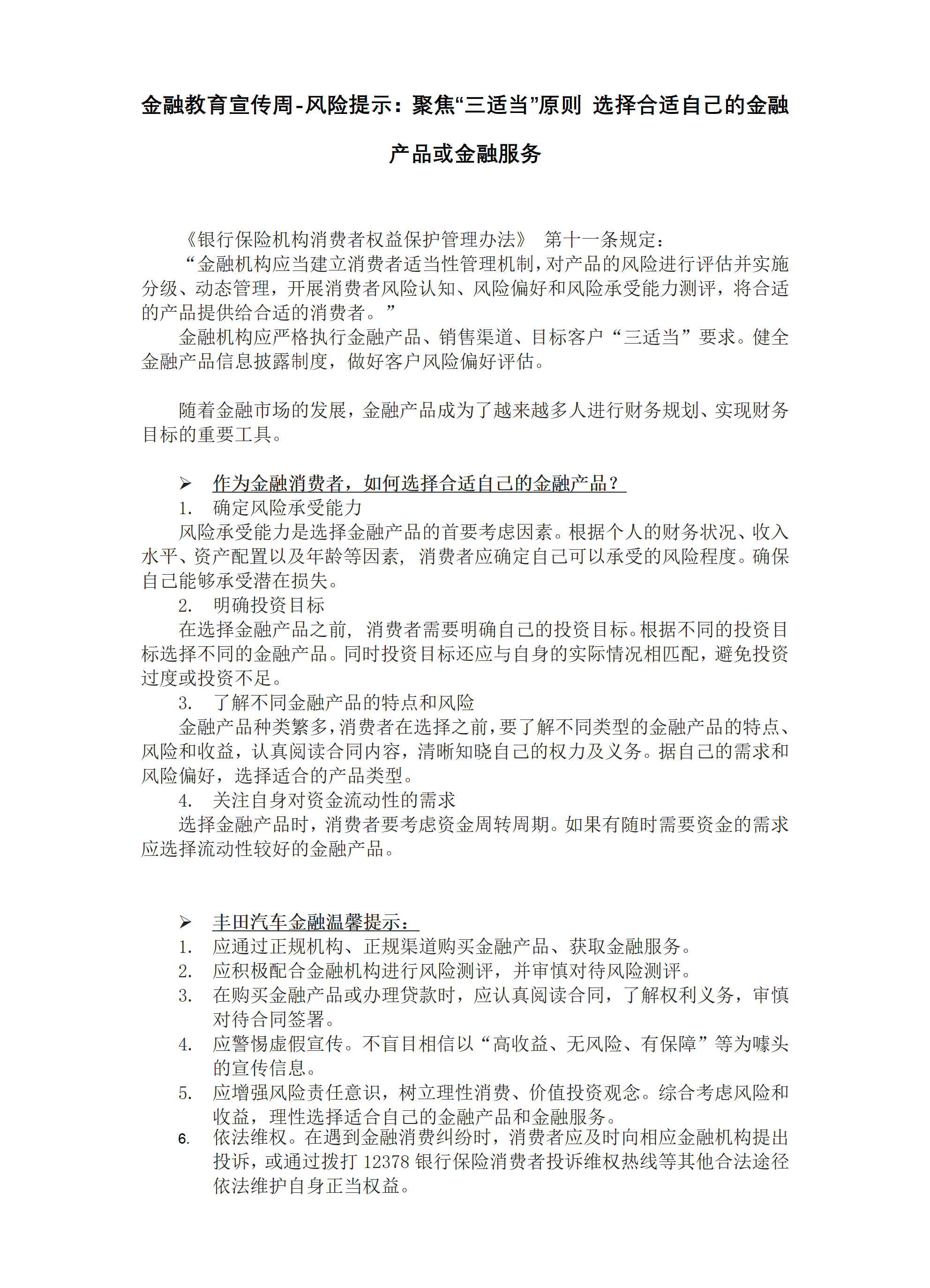 金融教育宣传周-风险提示:聚焦“三适当”原则 选择合适自己的金融产品或金融服务