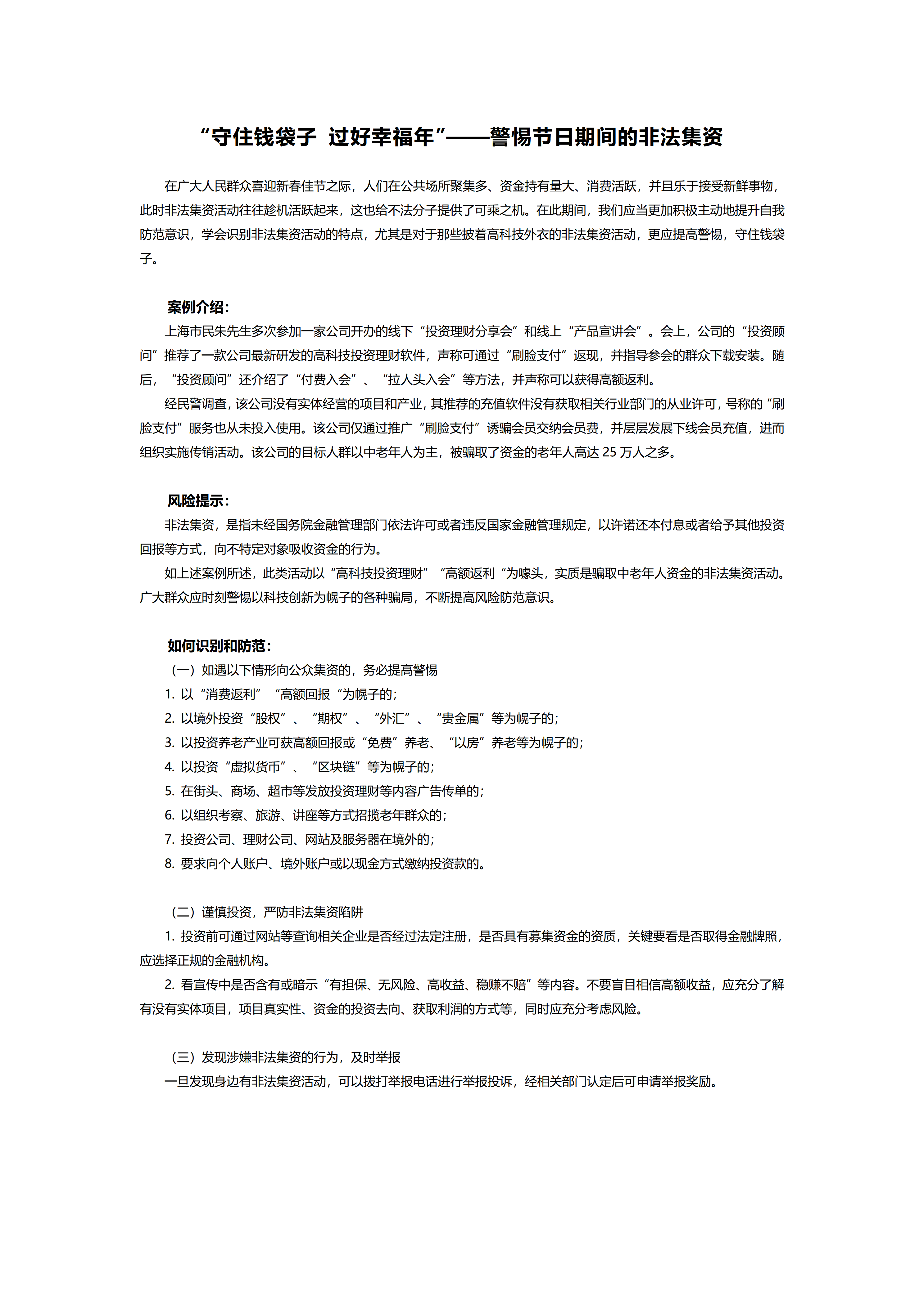 “守住钱袋子 过好幸福年”——警惕节日期间的非法集资